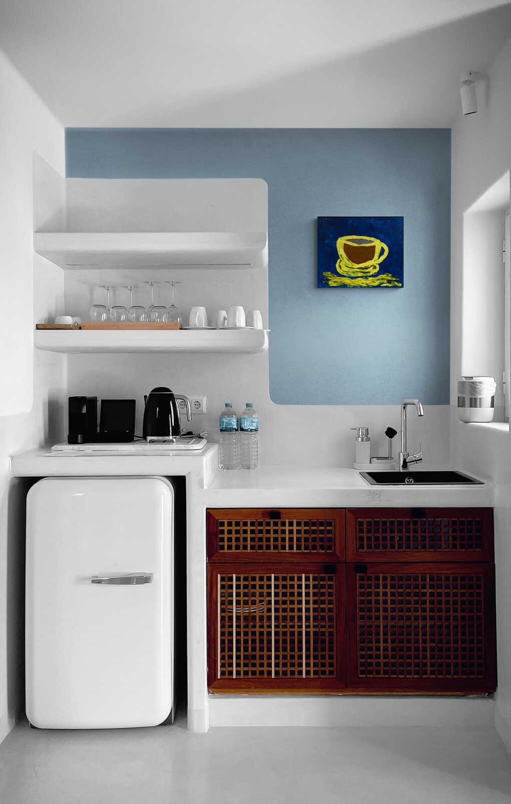 A vibrant and bold depiction of a yellow cup set against a deep blue background. The use of contrasting colors and thick brushstrokes creates a dynamic and eye-catching piece.