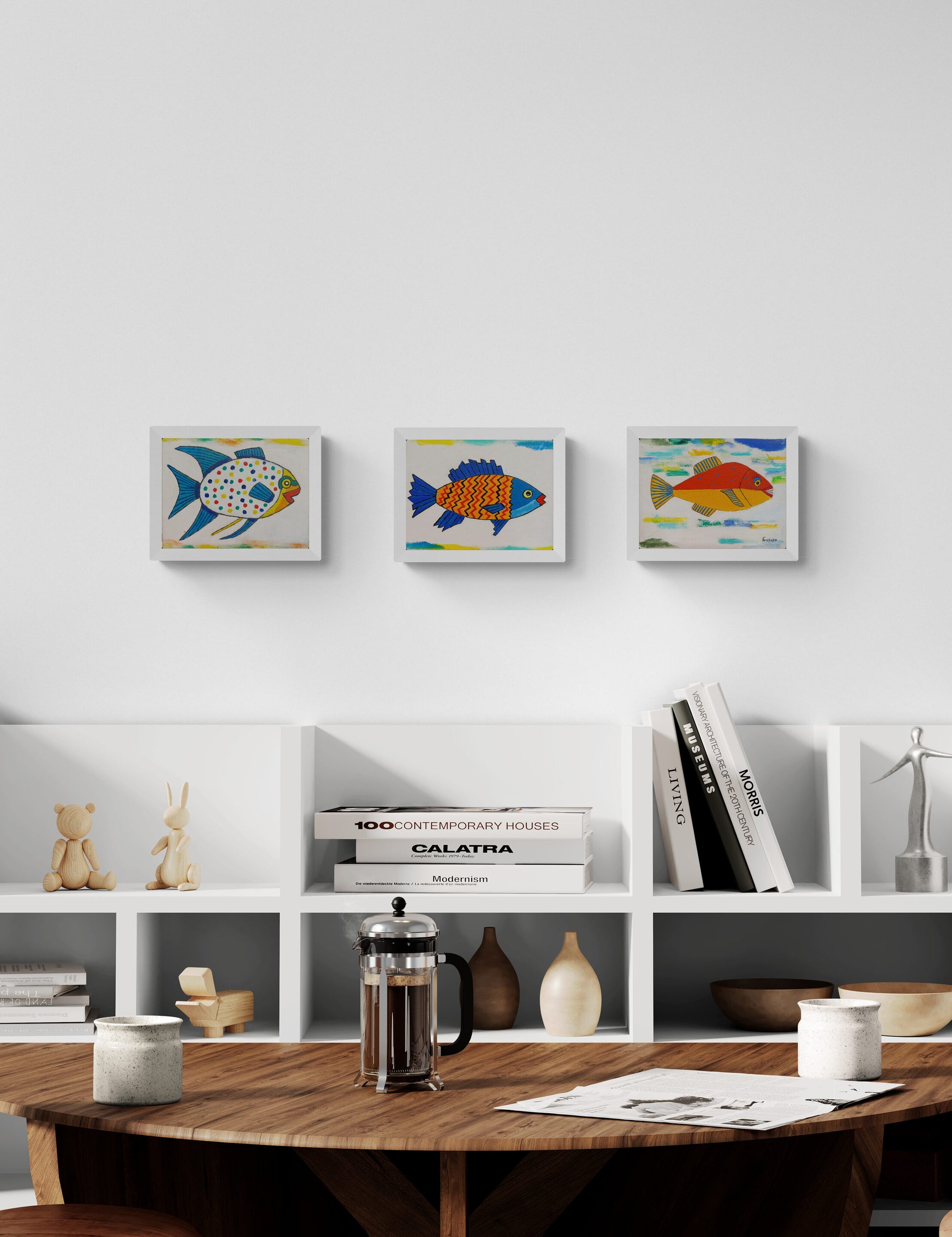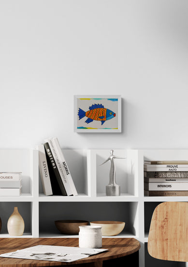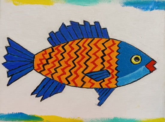 A dynamic, colorful depiction of a stylized fish swimming boldly across the canvas. The fish's body is primarily composed of a vibrant orange with black zigzag patterns, creating a sense of movement and texture. The contrasting deep blue head, fins, and tail add striking visual contrast, making the fish pop against the white background. The simple, clean lines and bright, unblended colors give the painting a playful, almost cartoonish quality. Small splashes of yellow, turquoise, and green appear at the edges, subtly framing the scene and adding depth to the overall composition. This work embodies a sense of whimsy and creativity, embracing bold color choices and geometric patterns to capture the viewer's attention.
