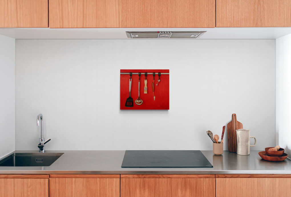 A realistic portrayal of everyday kitchen tools hanging against a striking red background. This still life composition highlights the beauty in mundane objects through detailed rendering and contrasting colors.