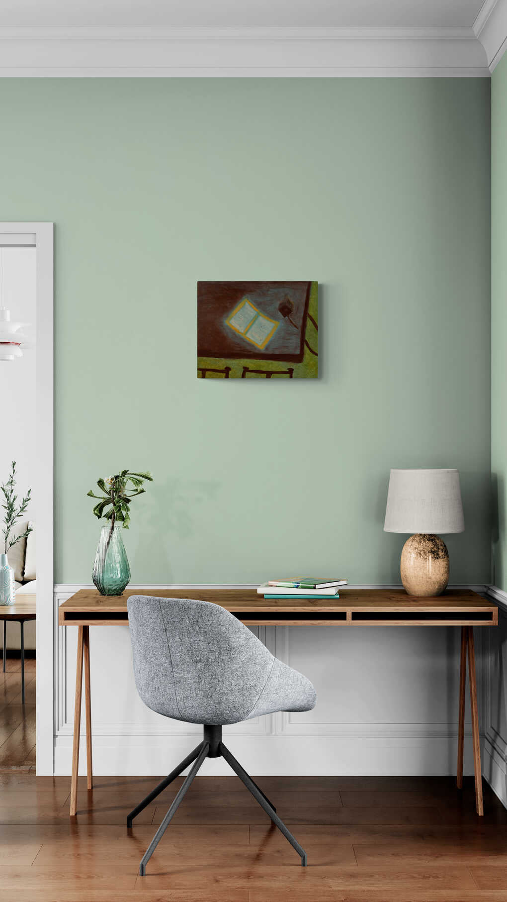 This painting features an open book glowing with light on a dark tabletop. The contrasting colors and the soft, radiating light create a focal point that draws the viewer's attention, symbolizing knowledge and enlightenment.