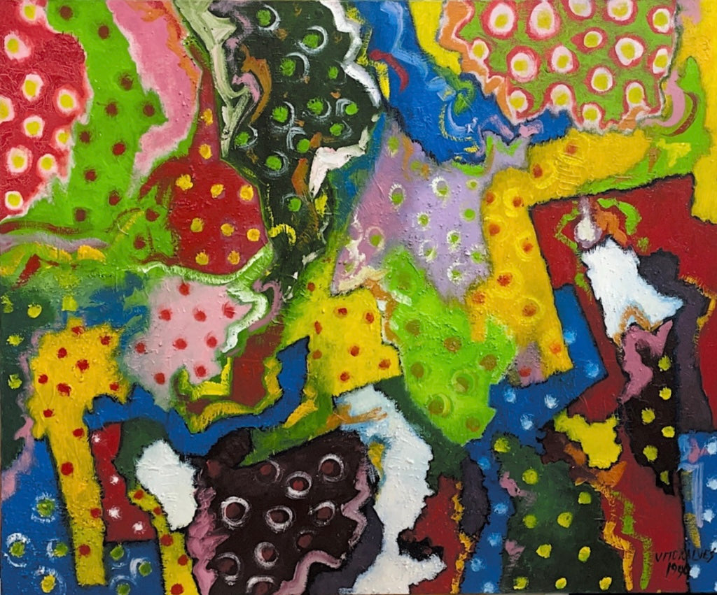 This painting is a riot of color and pattern, with an array of organic shapes and dots in bold greens, pinks, yellows, and blues. The overlapping forms and vibrant palette evoke a sense of a fantastical, whimsical garden, teeming with life and energy.