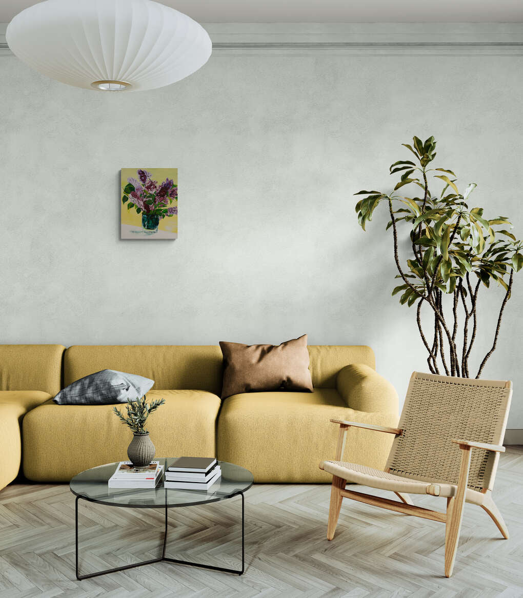 A vibrant and detailed still life painting depicting a bouquet of lilacs in various shades of purple and lavender, arranged in a clear glass vase. The flowers are lush and full, with rich green leaves adding contrast. The vase sits on a white surface, and the background is a soft yellow, which complements the colors of the lilacs and adds a warm, inviting atmosphere to the painting.