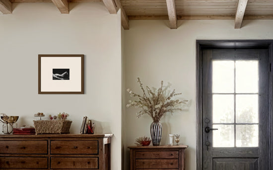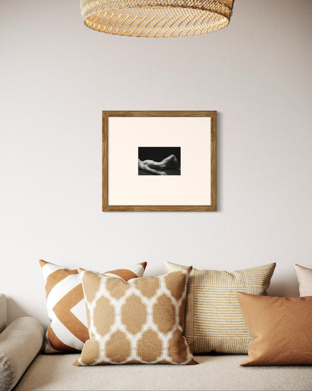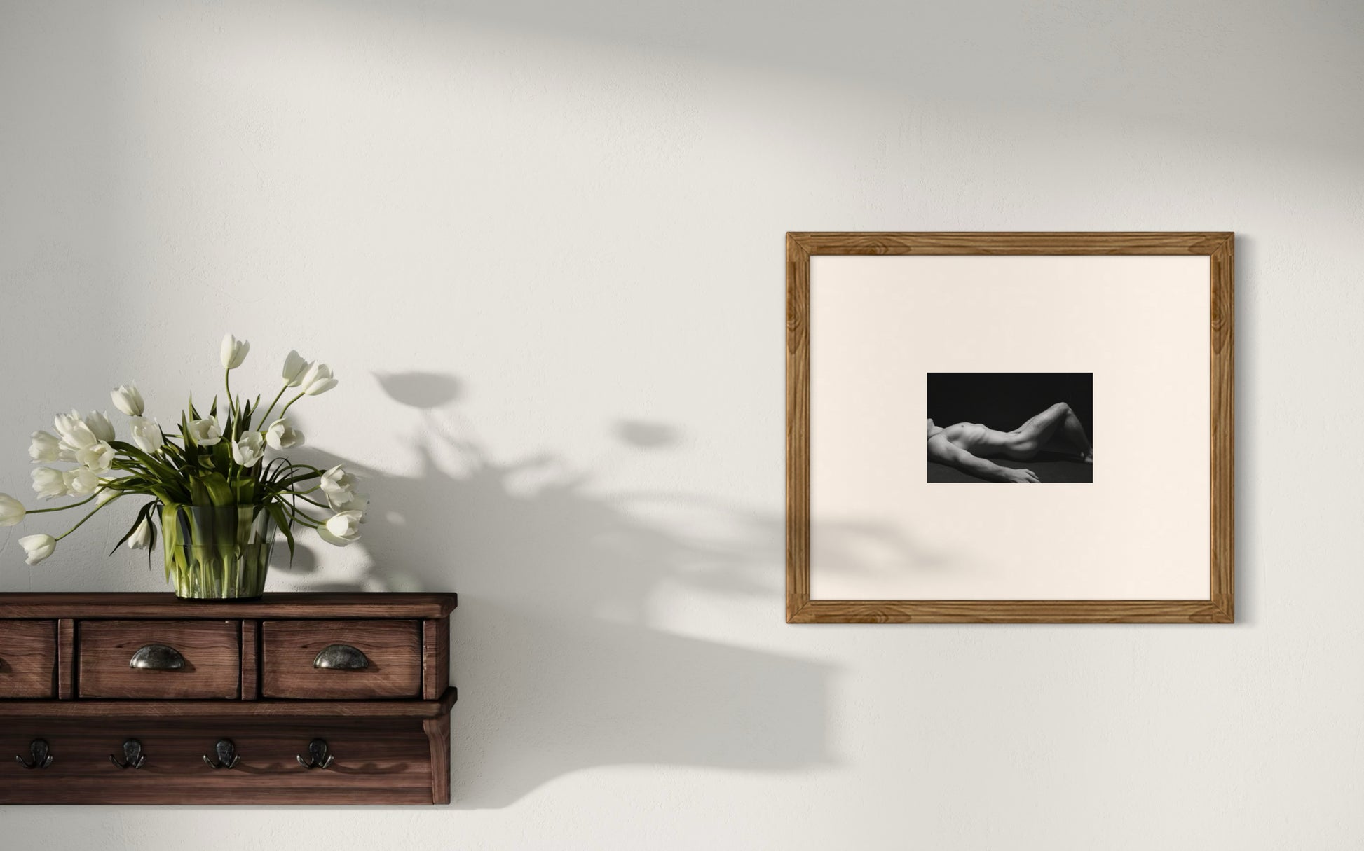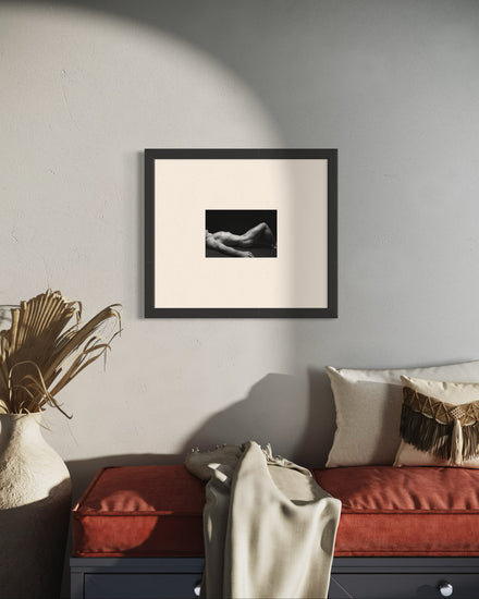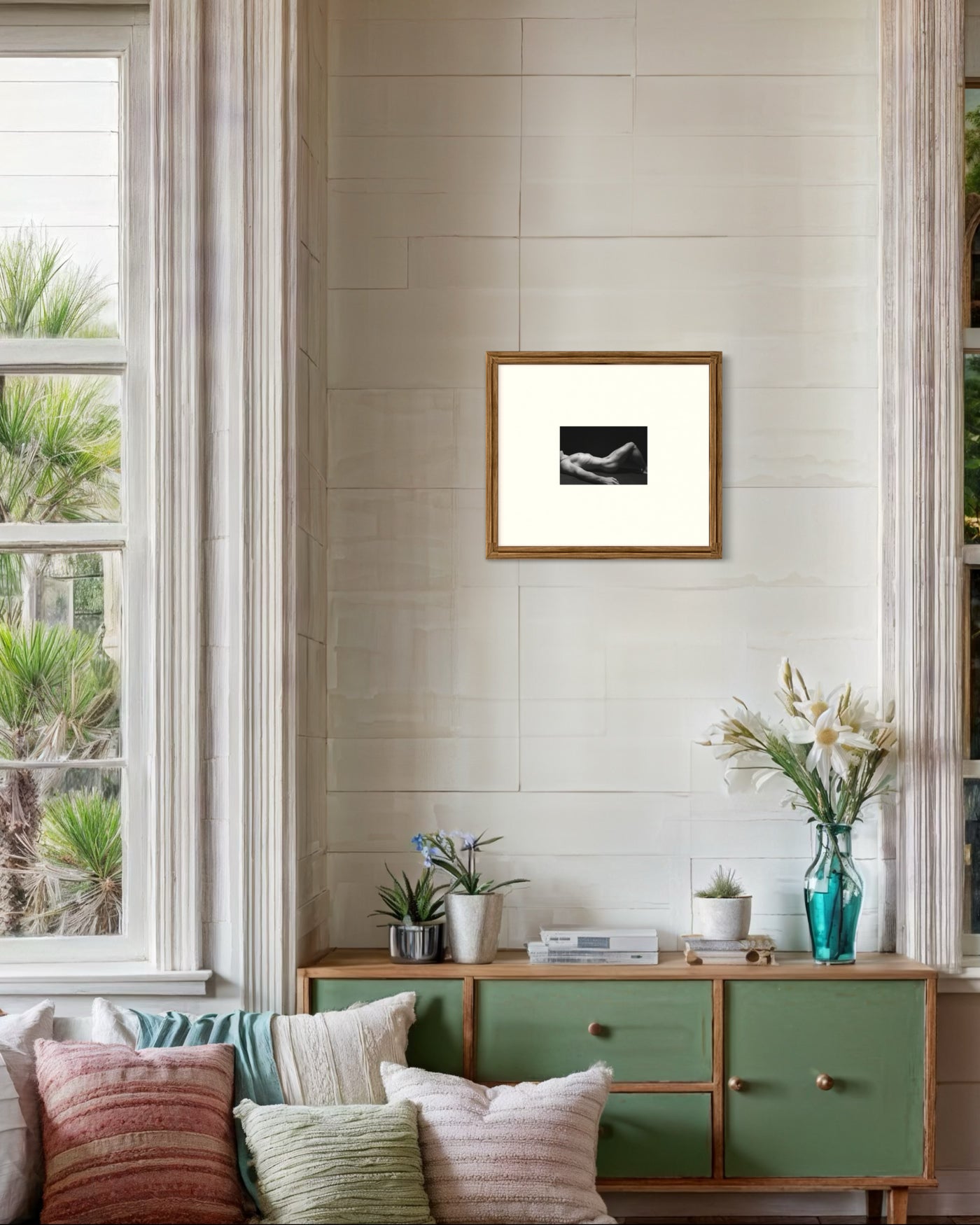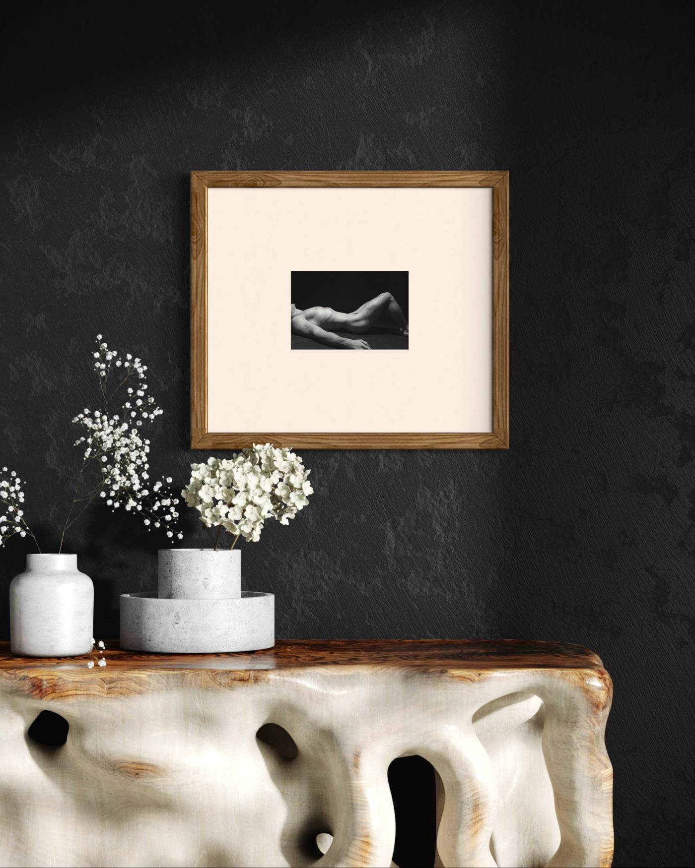 A iluminação direcional enfatiza os planos do tronco e das pernas, chamando a atenção tanto para a musculatura sutil quanto para a natureza relaxada de sua pose.