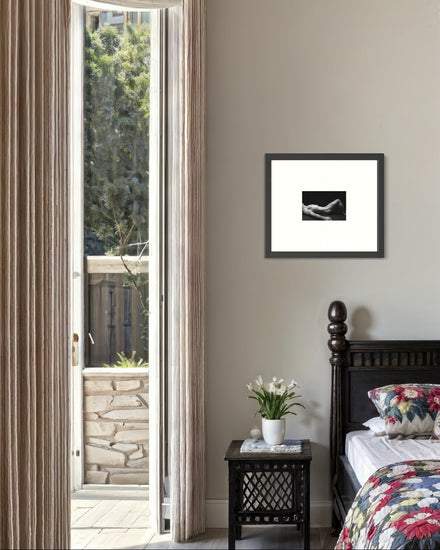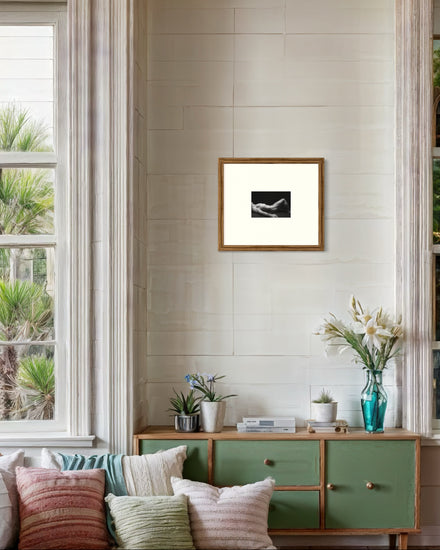 Nesta fotografia em preto e branco de Duda Breda, uma figura masculina nua é capturada deitada no chão, com uma perna dobrada enquanto a outra esticada.