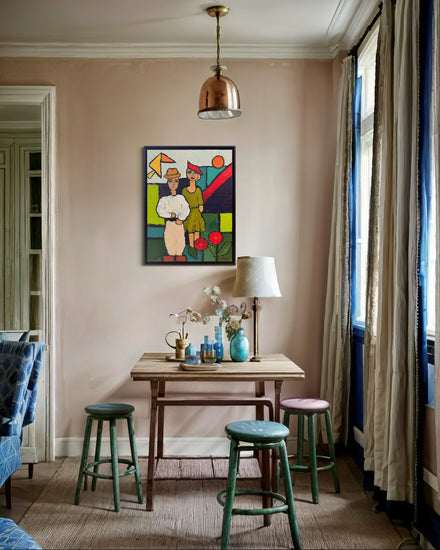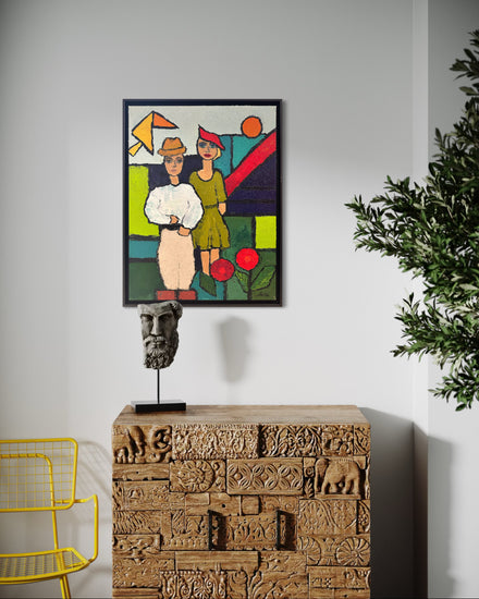"Promenade" presents a bold and stylized depiction of a couple walking through a geometric landscape. Featuring simplified shapes, vibrant blocks of colour, and confident brushwork, the artwork conveys a sense of nostalgic innocence and quiet companionship.