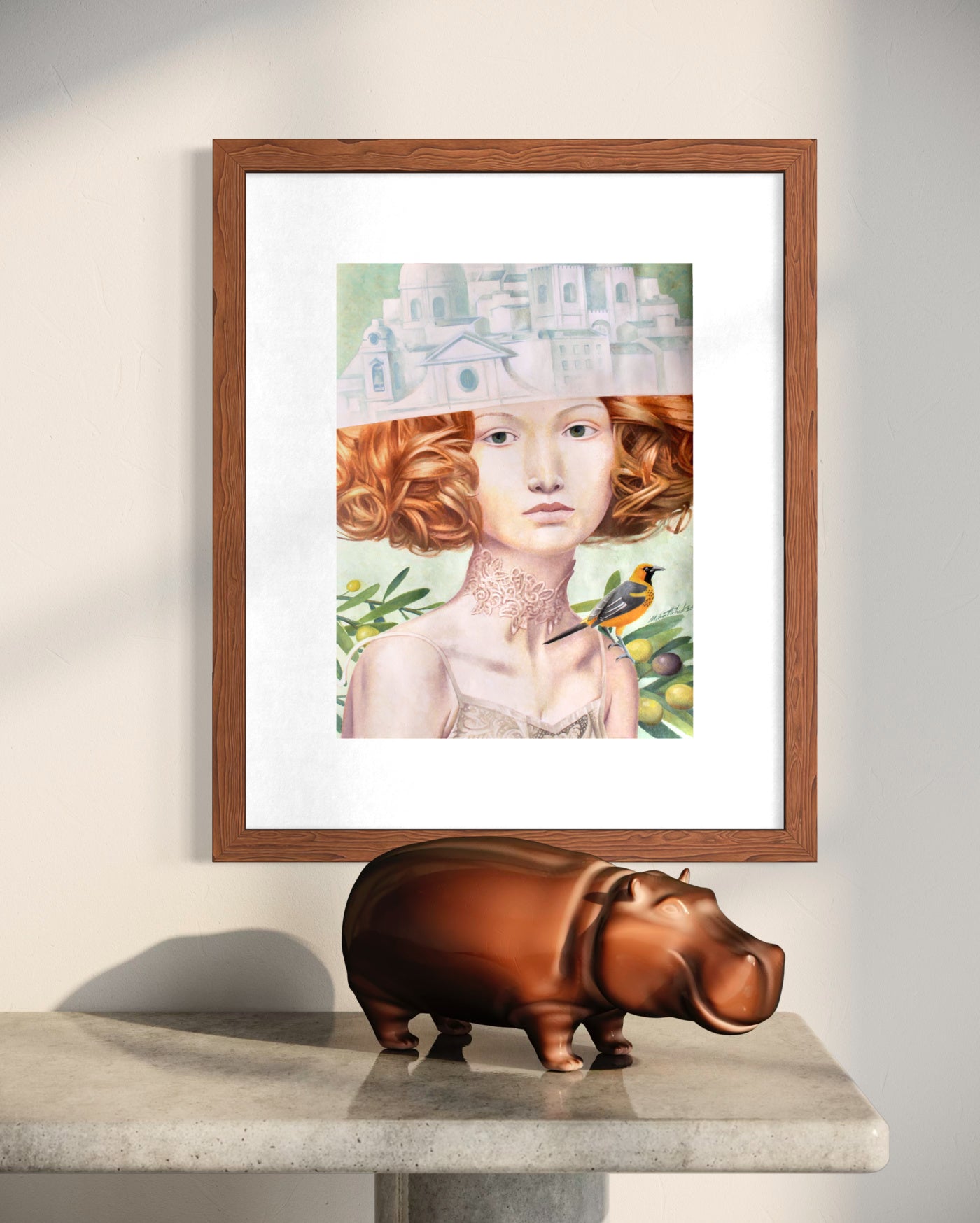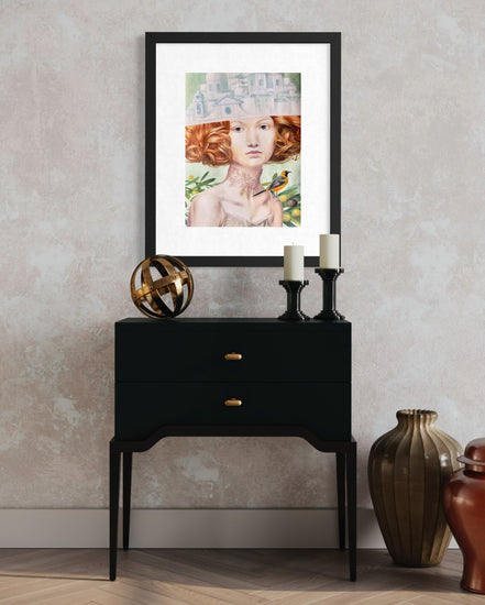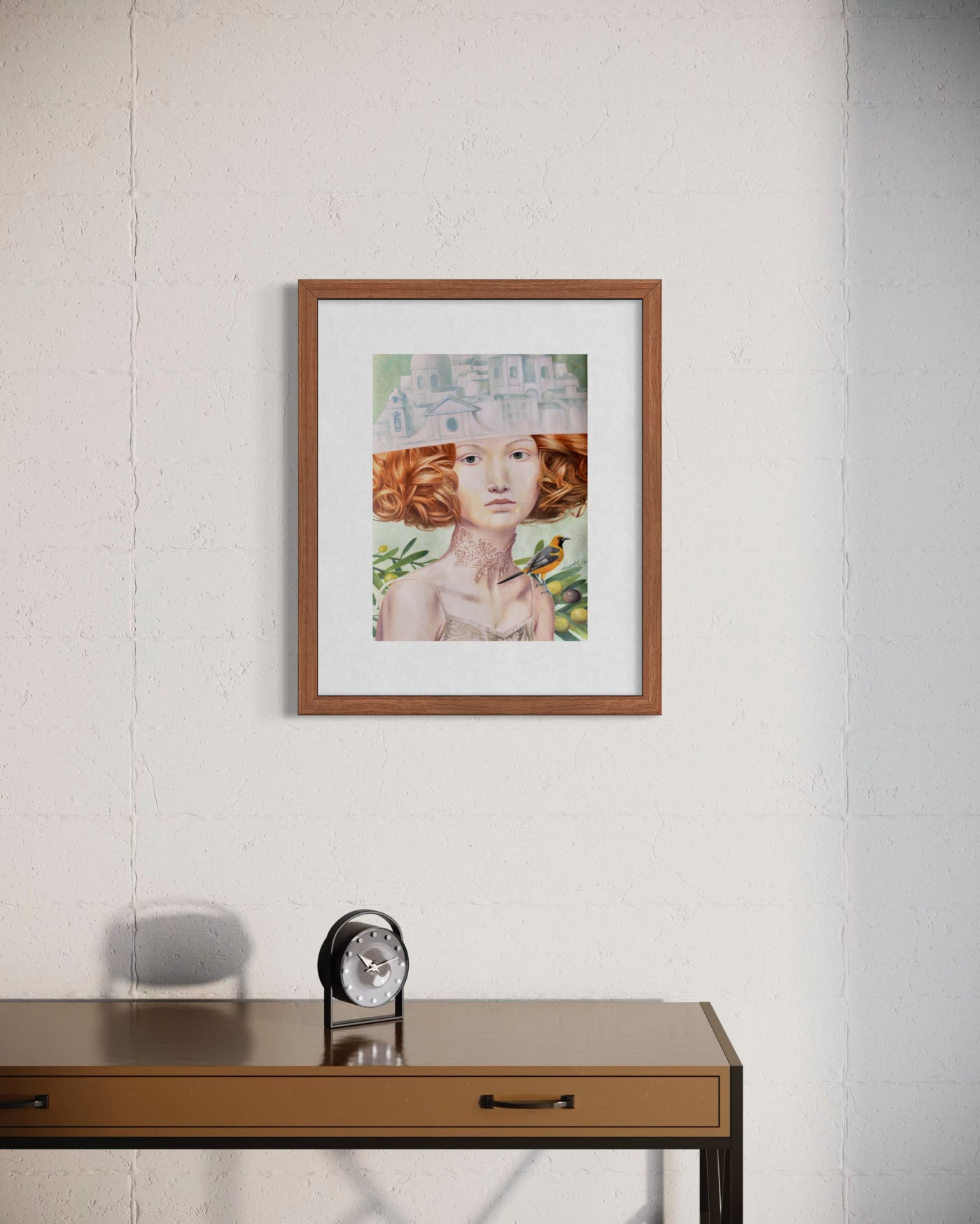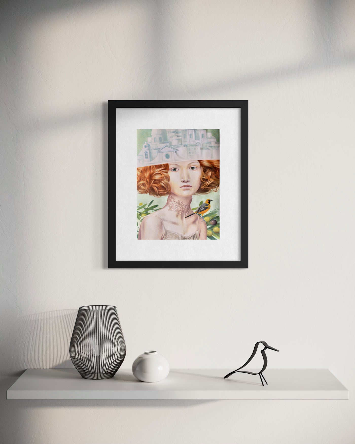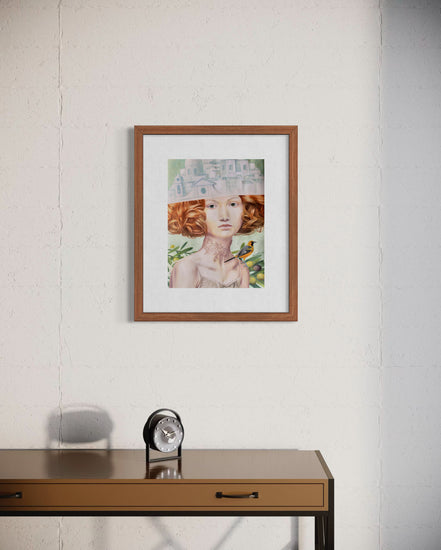Este retrato surrealista apresenta uma mulher com um volumoso cabelo cor de cobre, cuja parte superior da cabeça se transforma numa paisagem urbana arquitetónica monocromática. A sua pele pálida e os seus suaves olhos verdes evocam uma sensação de calma introspeção.