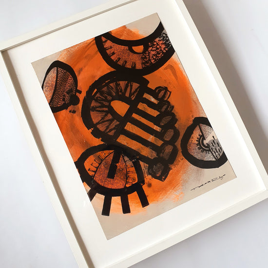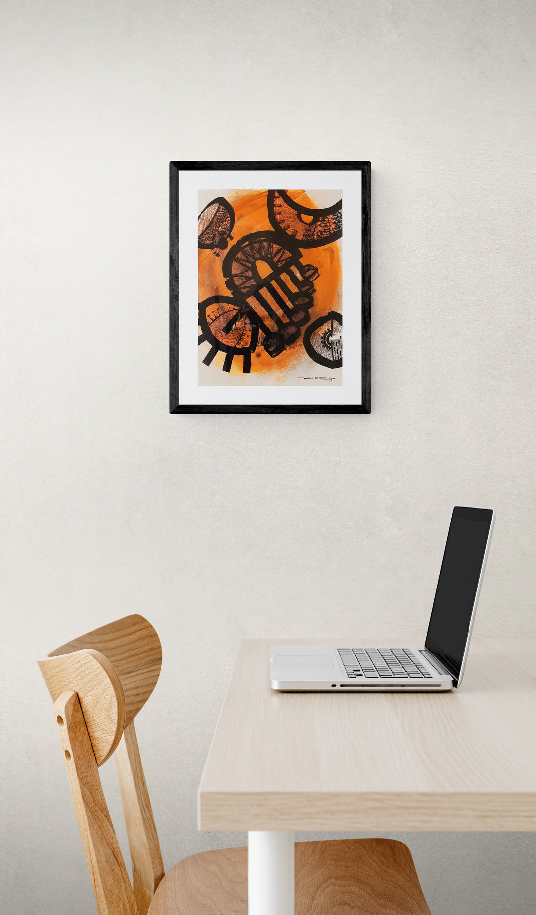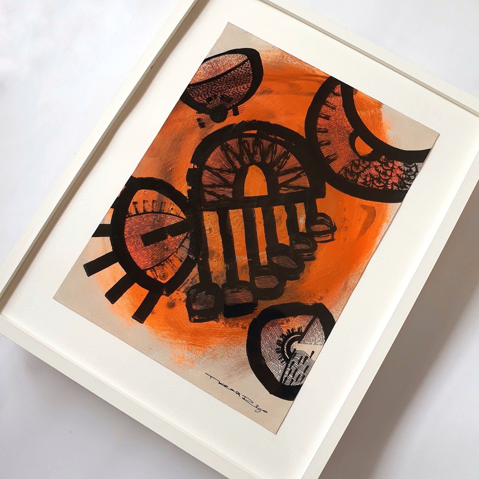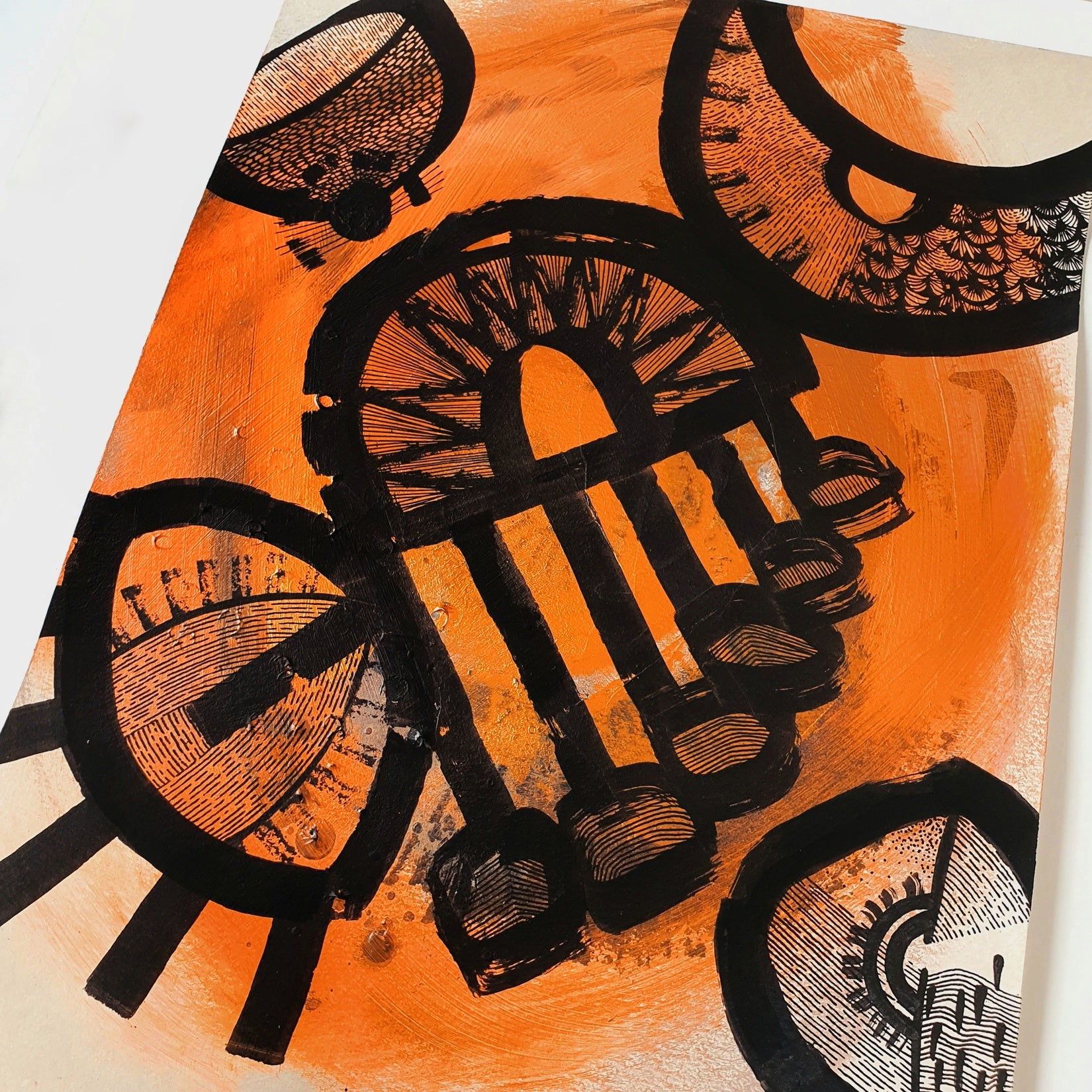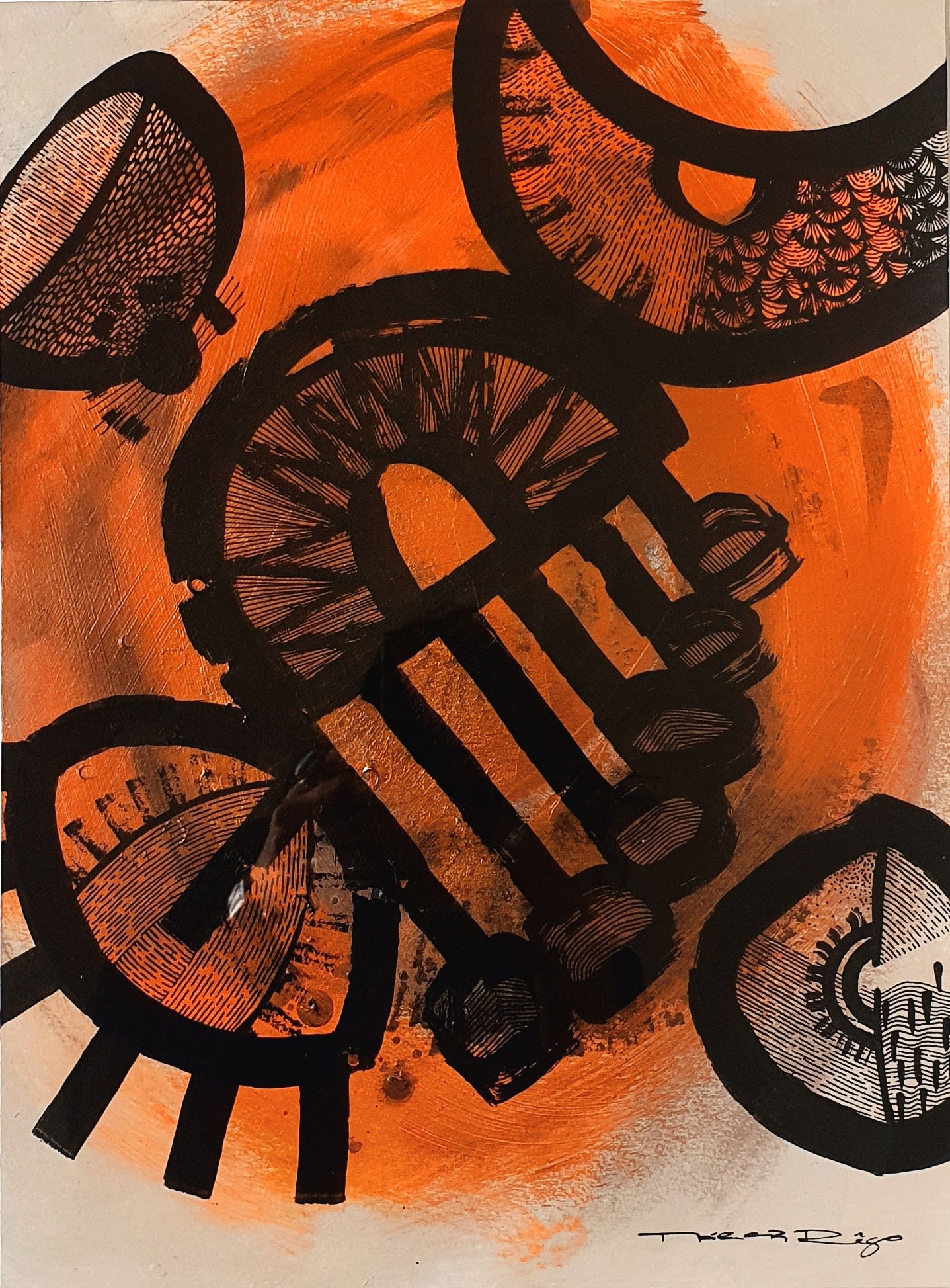 Bold, circular patterns dominate the composition, set against a warm, fiery backdrop. The black forms are etched with intricate textures, suggesting movement and rhythmic repetition.